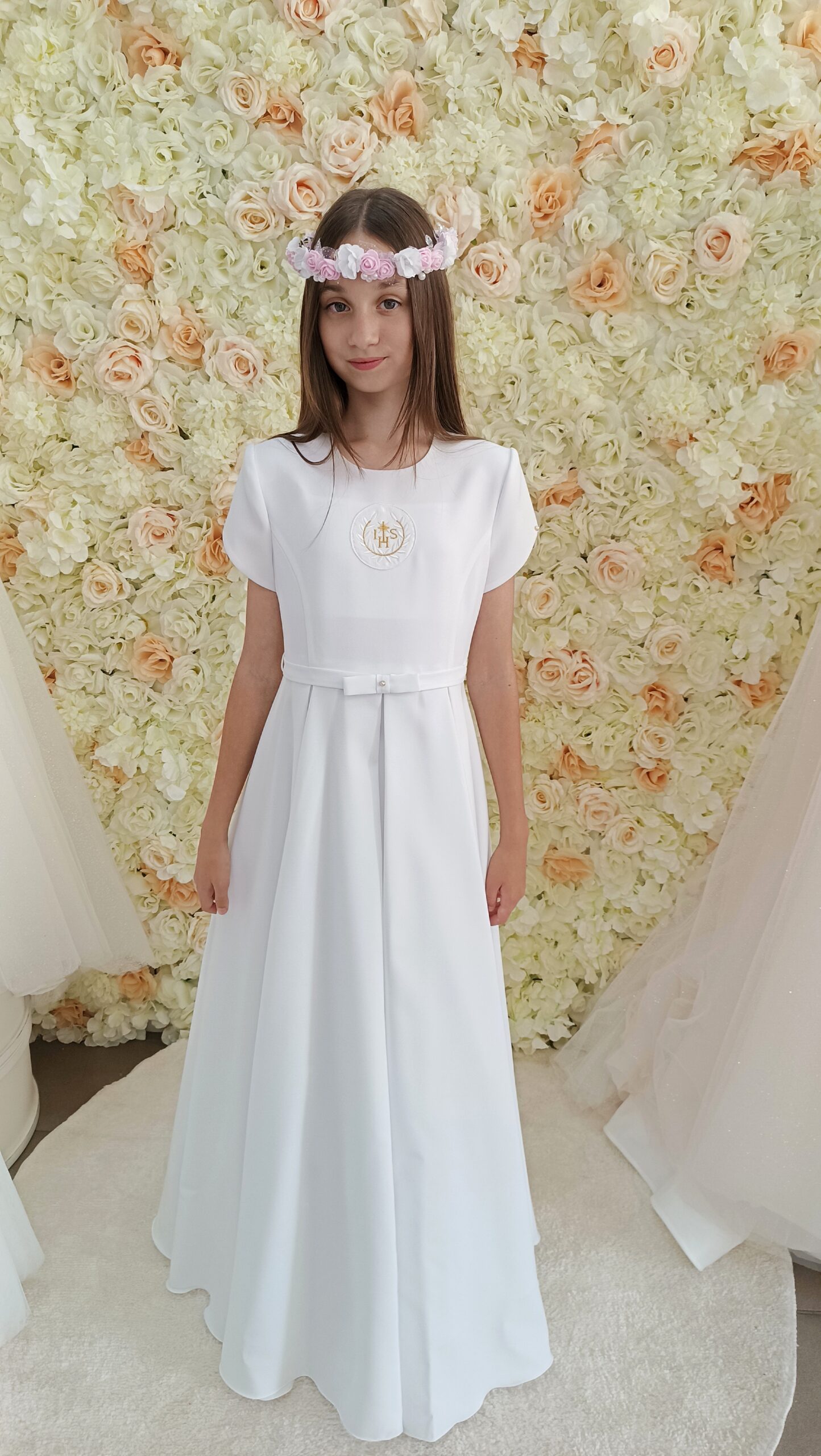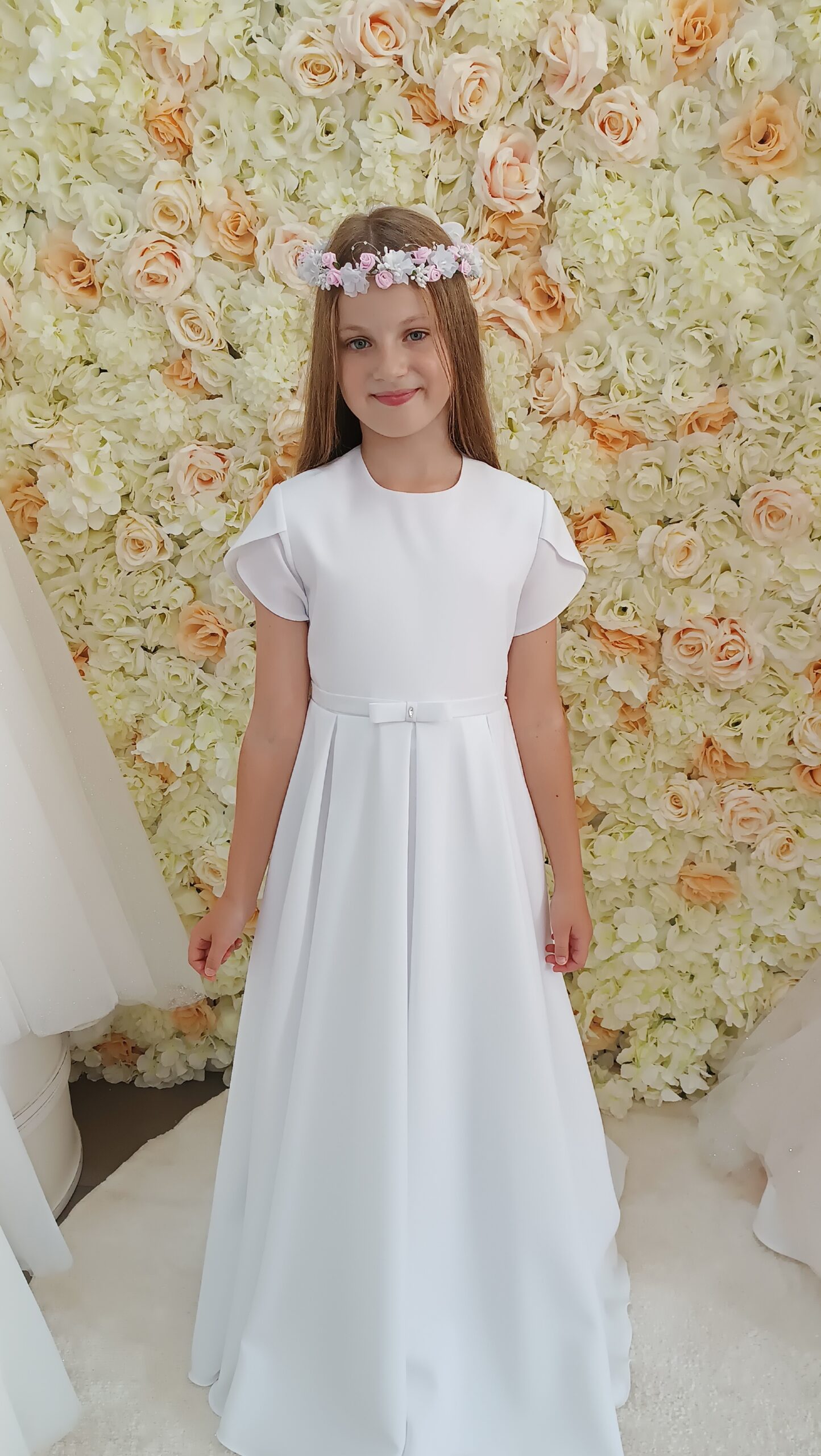 Model Hortensja to delikatna suknia komunijna bez cięć na bluzeczce, z uroczym rękawkiem typu tulipanek. Paseczek z kokardką ozdobiony jest błyszczącym dżecikiem, co nadaje całości dziewczęcego uroku.